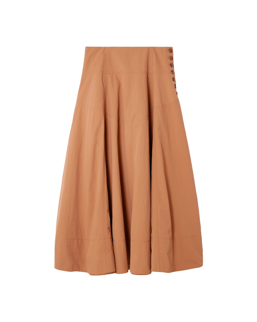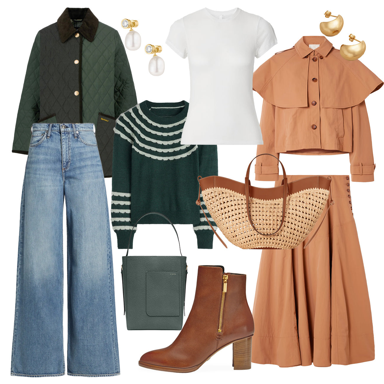 Saddle vachetta brings timeless polish to any fall wardrobe. For a casual-yet-refined take, pair it with denim, a chunky knit, and a hunter green Barbour jacket, giving weekend-ready style that feels both effortless and elevated. For a more transitional look, try a cedar-brown matching set with a ruffled jacket and midi skirt, finished with a raffia tote.