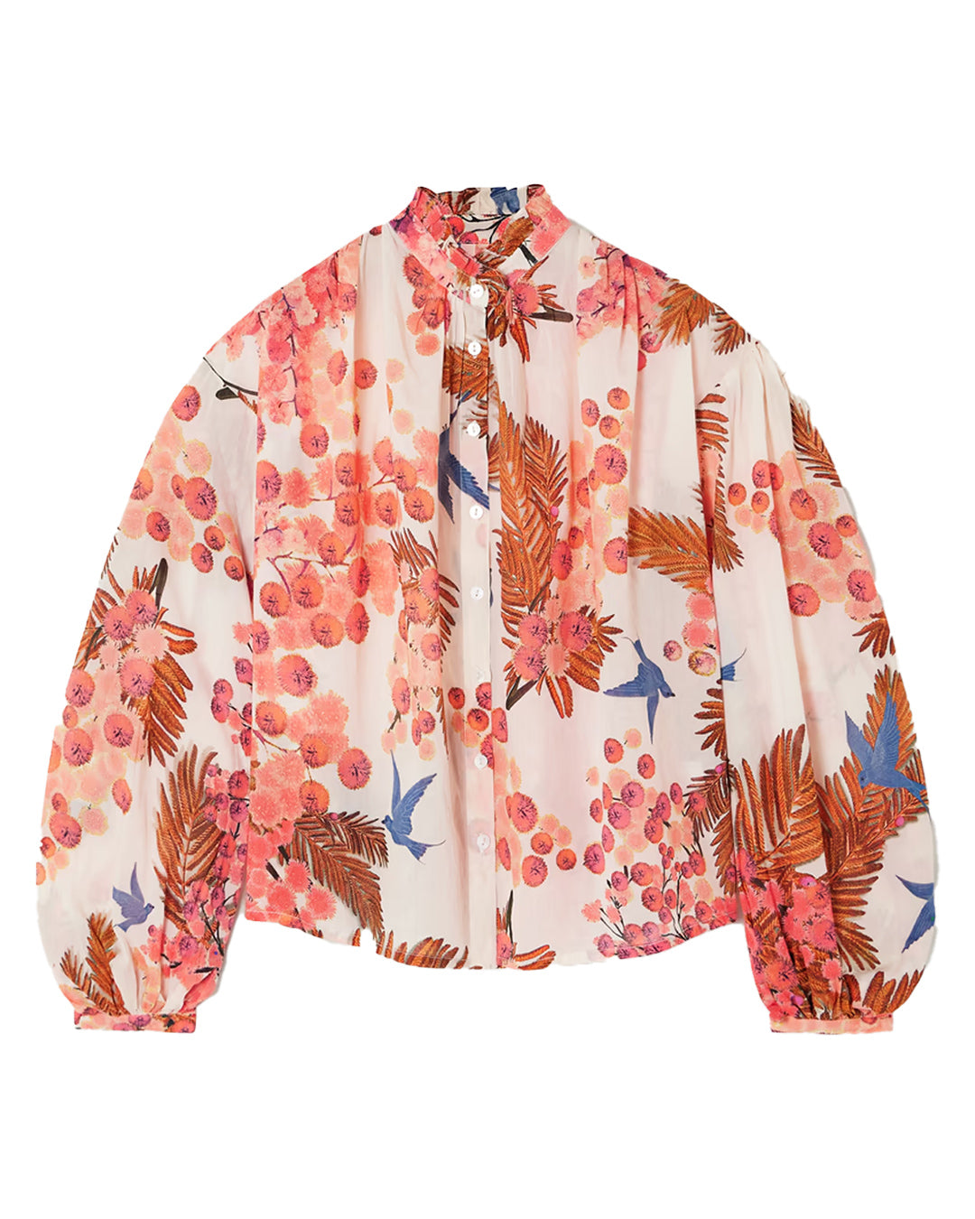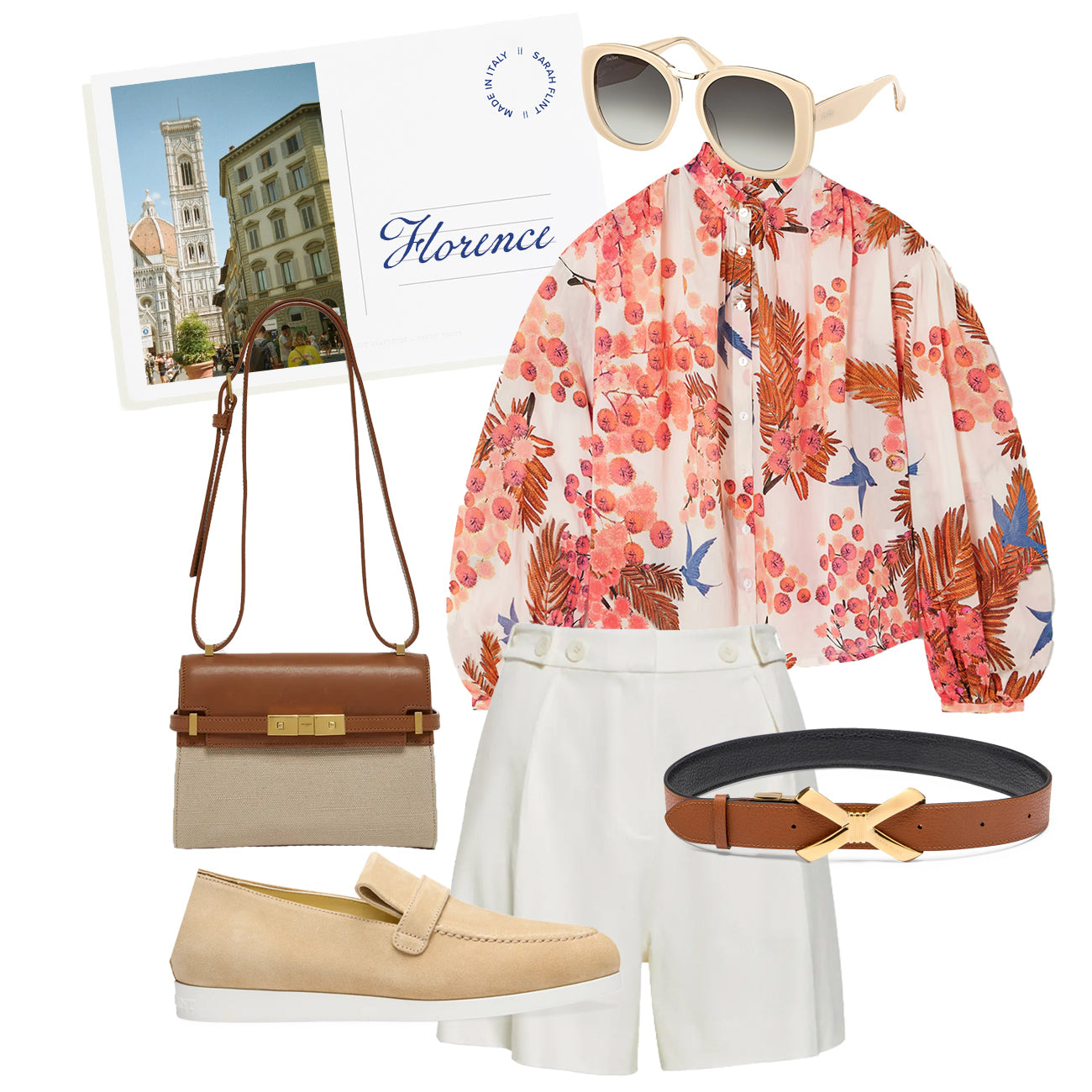 Artful layers and rich florals define this Florence-ready ensemble. A sheer blouse and tailored white shorts balance feminine prints with structure, while the Alysia sneaker keeps it grounded. A look made for museum visits, market strolls, or golden hour spritzes.