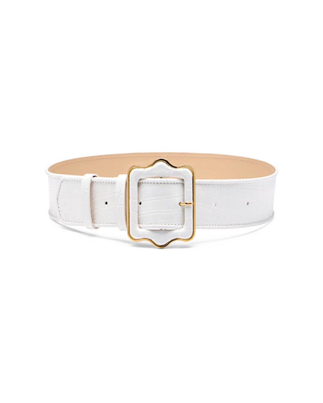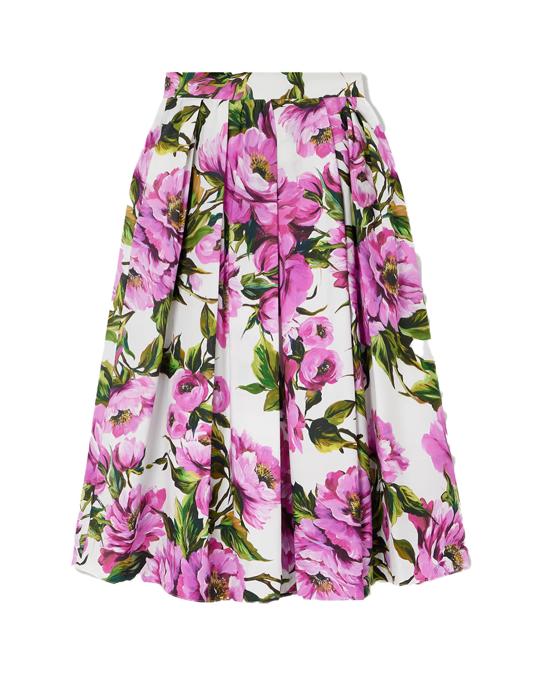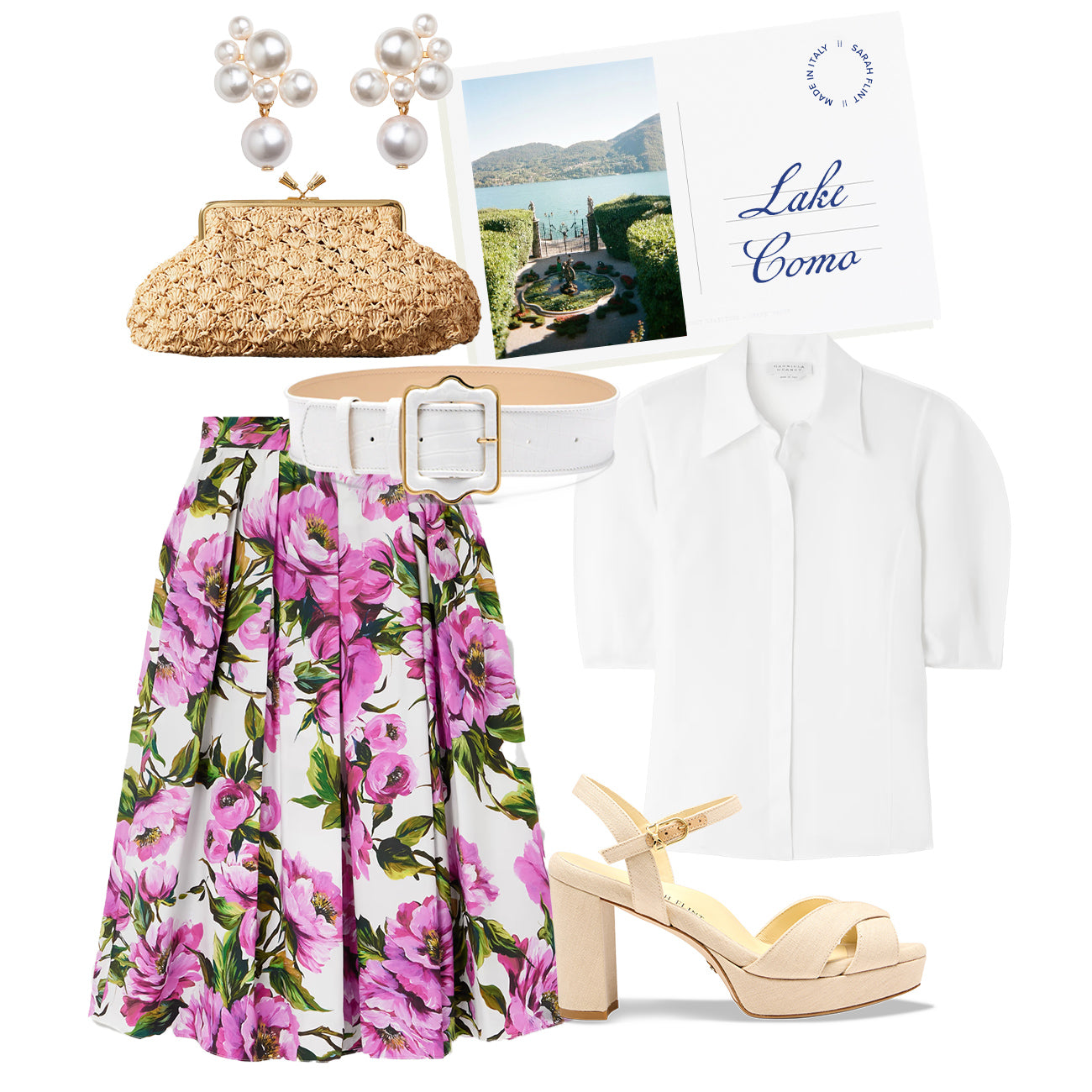 Timeless and romantic, this Lake Como look is ideal for garden lunches or villa getaways. A structured top and floral skirt feel elevated yet breezy, while raffia accessories and the Perfect Crossover Platform add a vacation-ready finish.