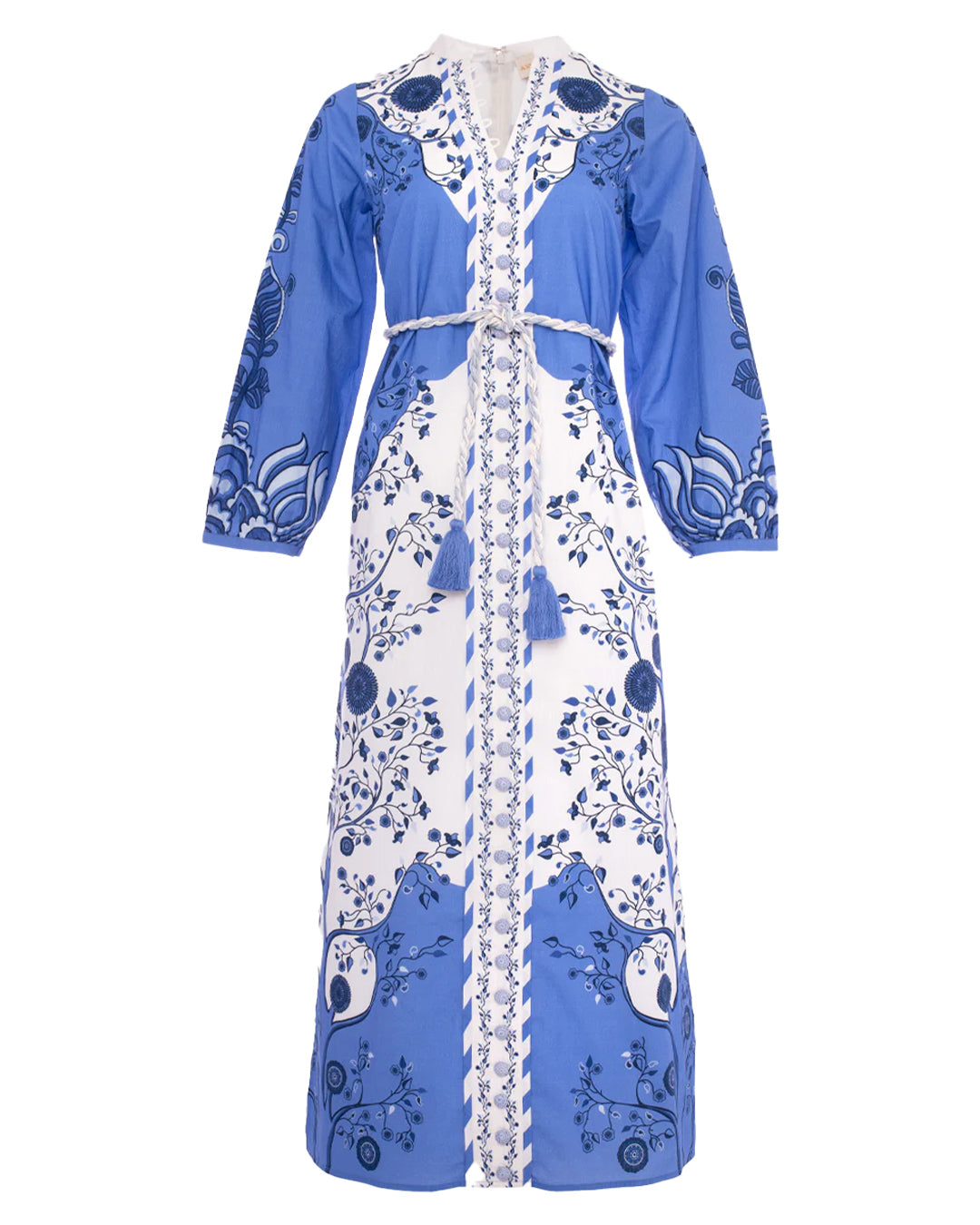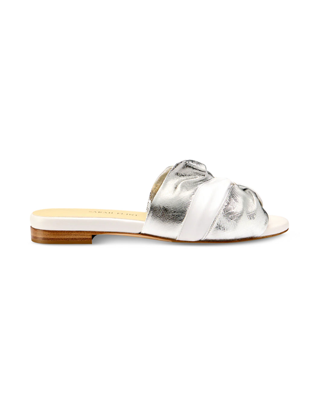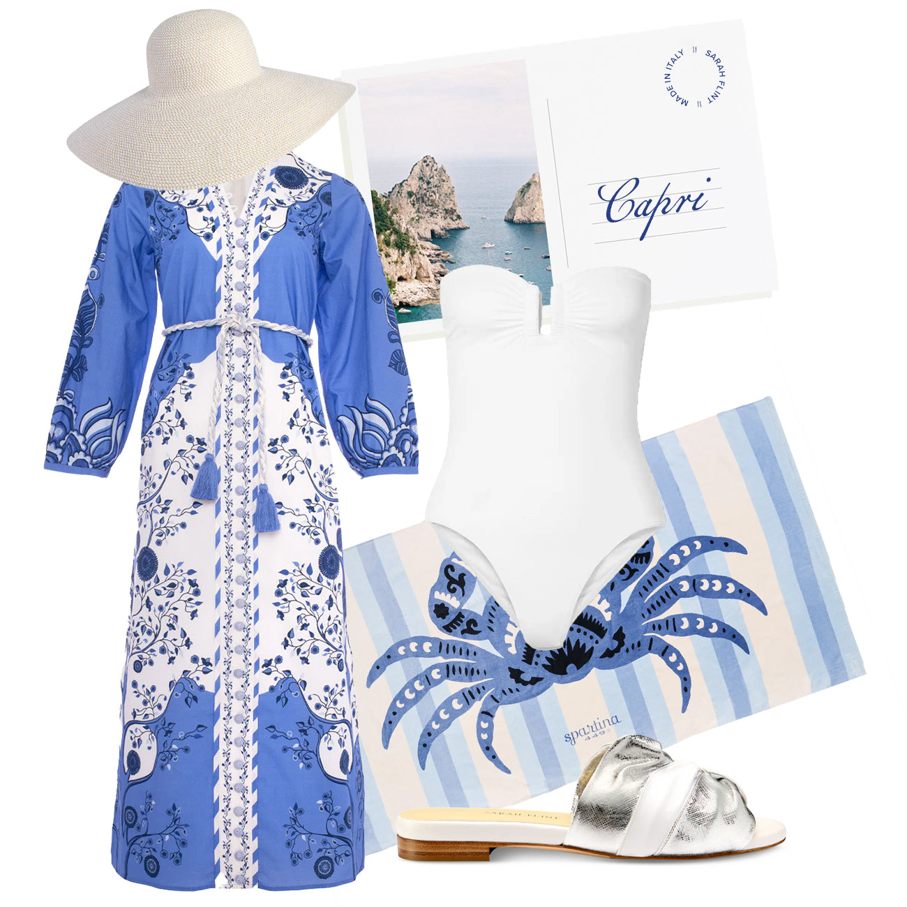 Bright whites and Mediterranean blues take center stage in this Capri-inspired outfit. From the embroidered dress to the sleek Arabesque slide, it’s a look that evokes iconic Italian elegance with a modern twist. Perfect for a yacht day or lunch with a view.