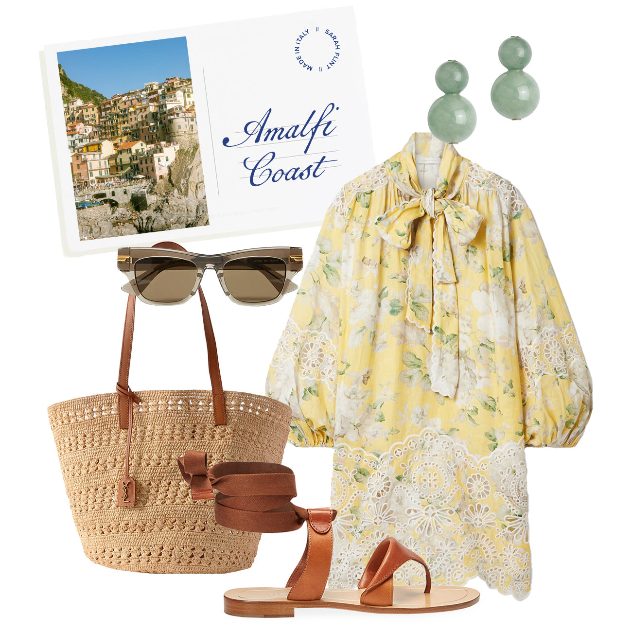 Effortless glamour meets sun-drenched shores in this look. A lemon-yellow printed dress pairs perfectly with warm-weather staples like our Grear sandal and raffia accessories, creating an outfit ideal for coastal strolls or aperitivo hour. Shop the look that channels the spirit of la dolce vita.