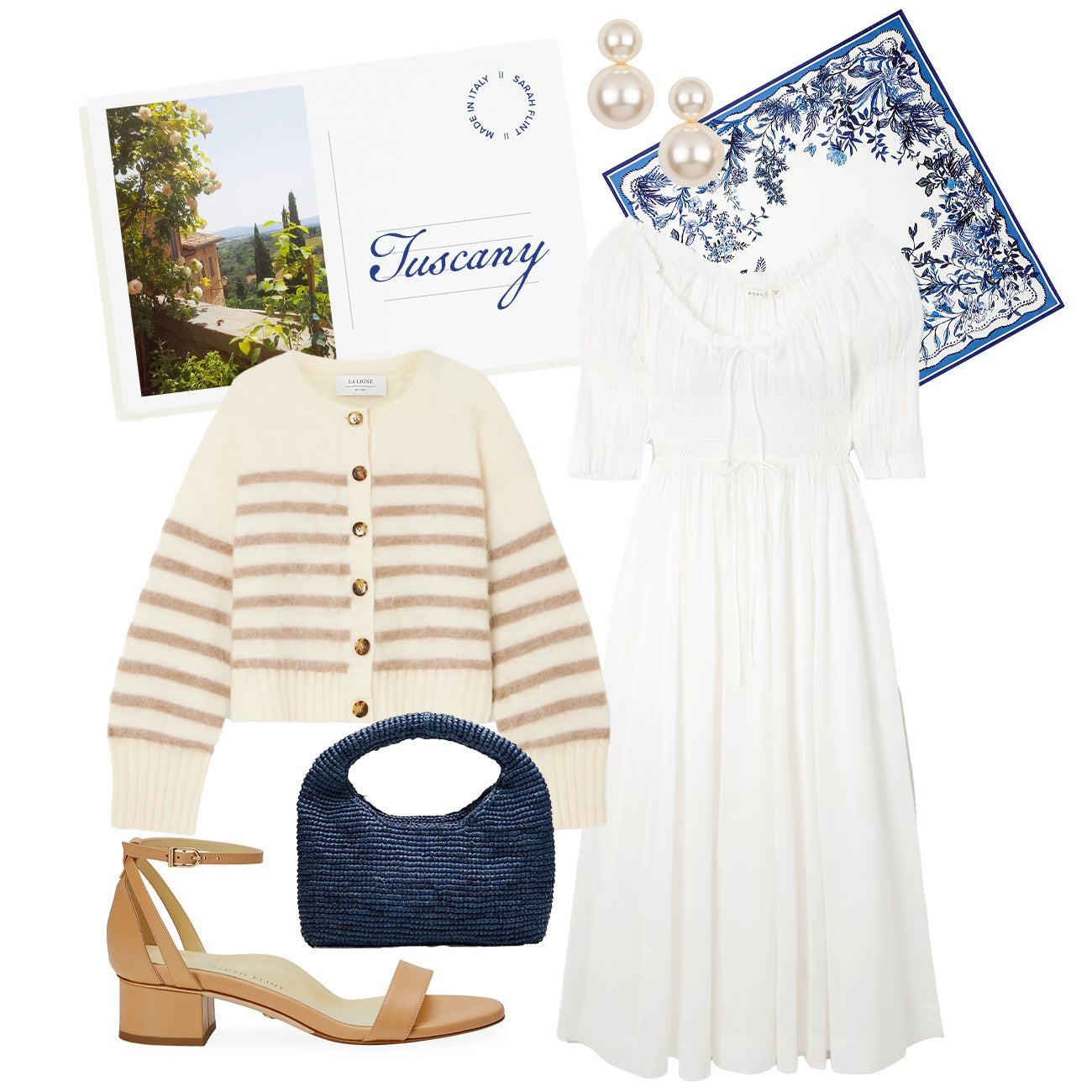 Channel pastoral elegance with this Tuscany look: a flowy white dress paired with a striped cardigan and earthy accessories like our Perfect Block Sandal in sand. Designed for sun-dappled vineyards and alfresco dinners, it’s a study in relaxed sophistication with a countryside twist.