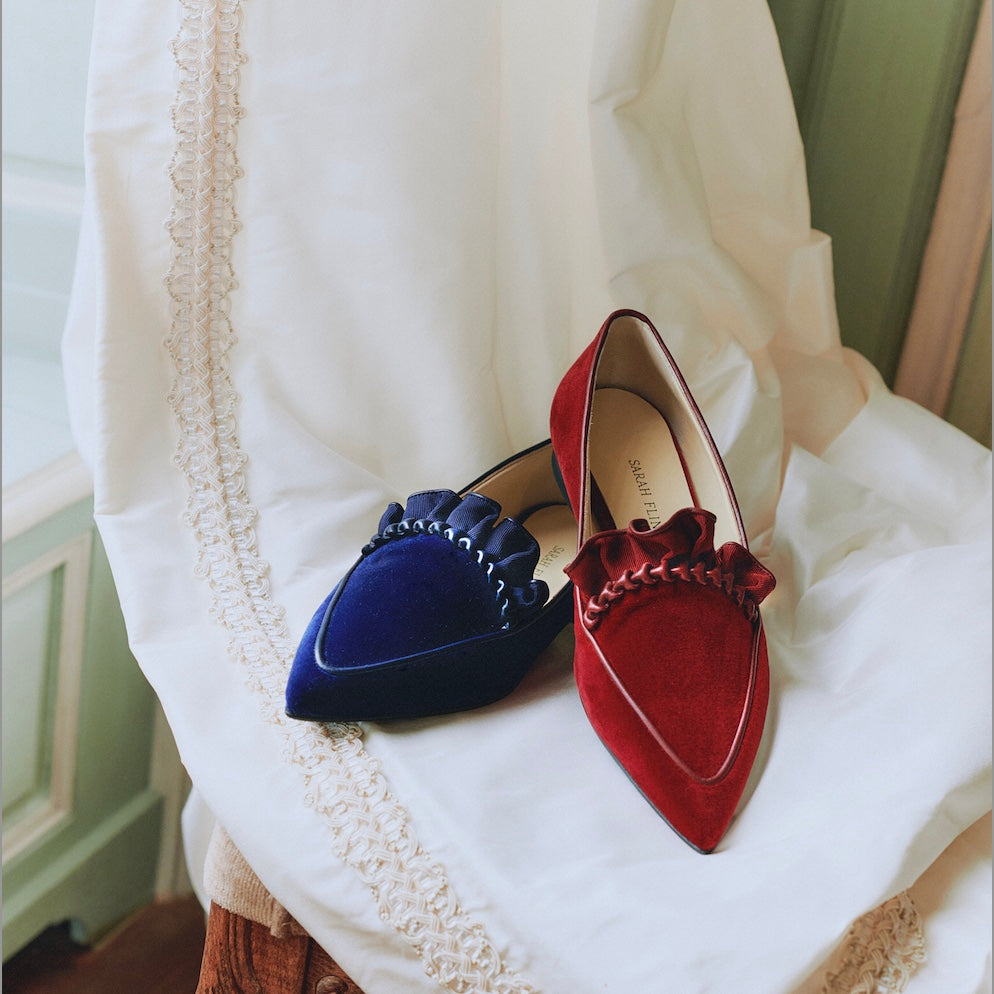 Part loafer, part smoking slipper, this pair features plush burgundy velvet with a ruffled grosgrain trim.