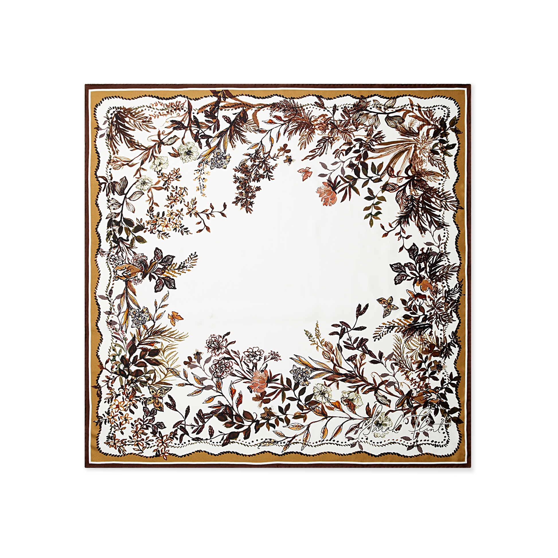 A 90cm silk scarf featuring chestnut florals and whimsical hidden bunnies.
