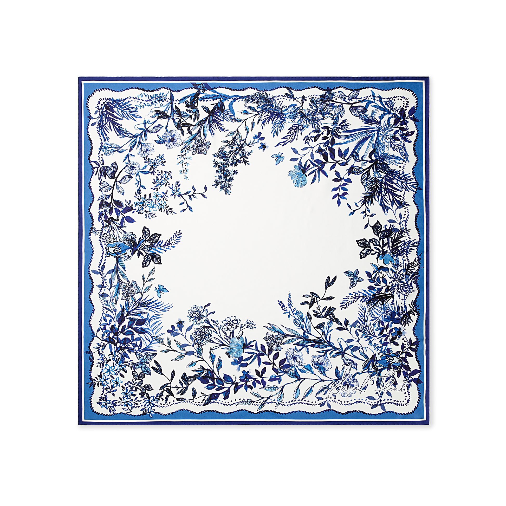 A 90cm silk scarf featuring blue florals and whimsical hidden bunnies.
