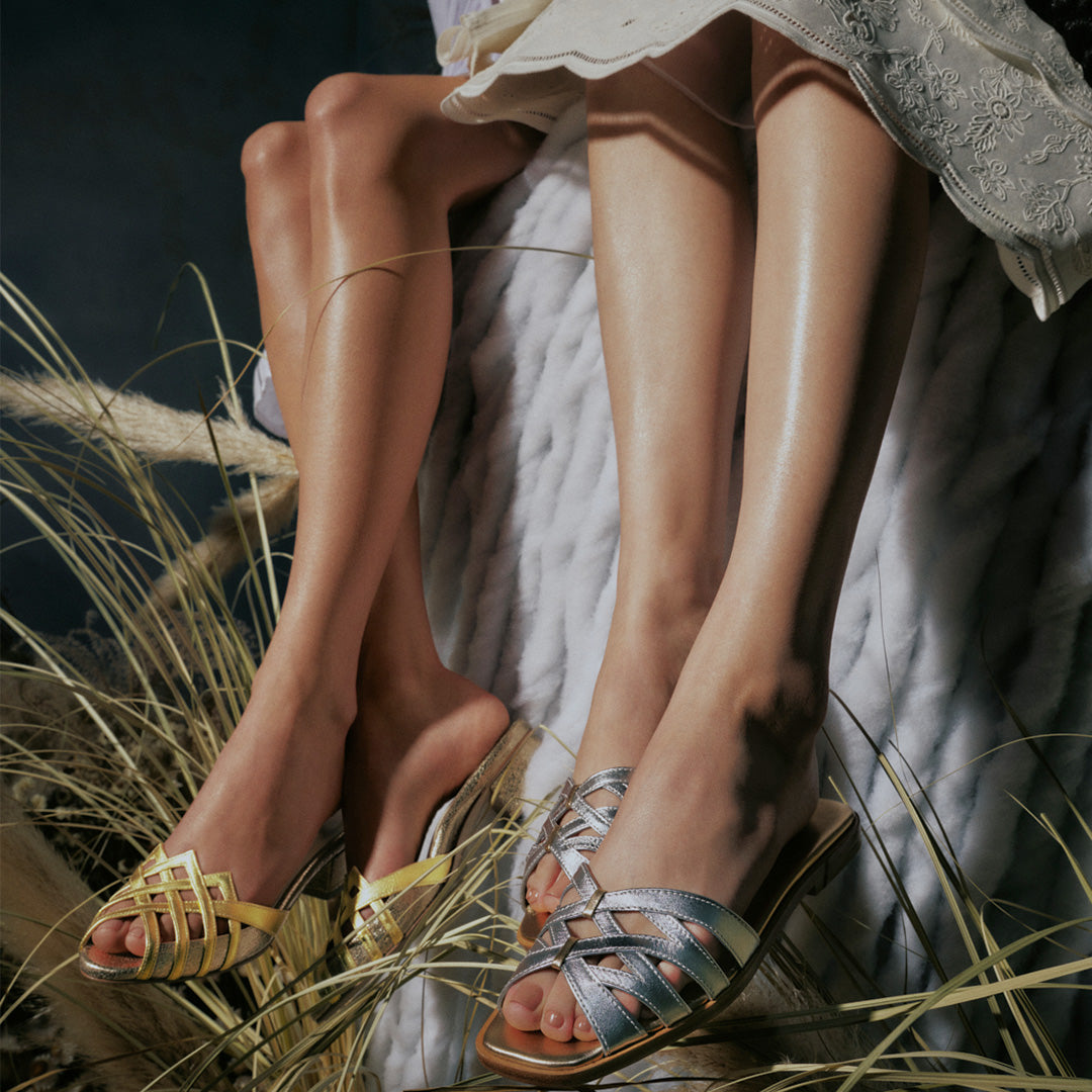 A slide sandal ready for summer, featuring intricate pattern work in gold and silver nappa leather.