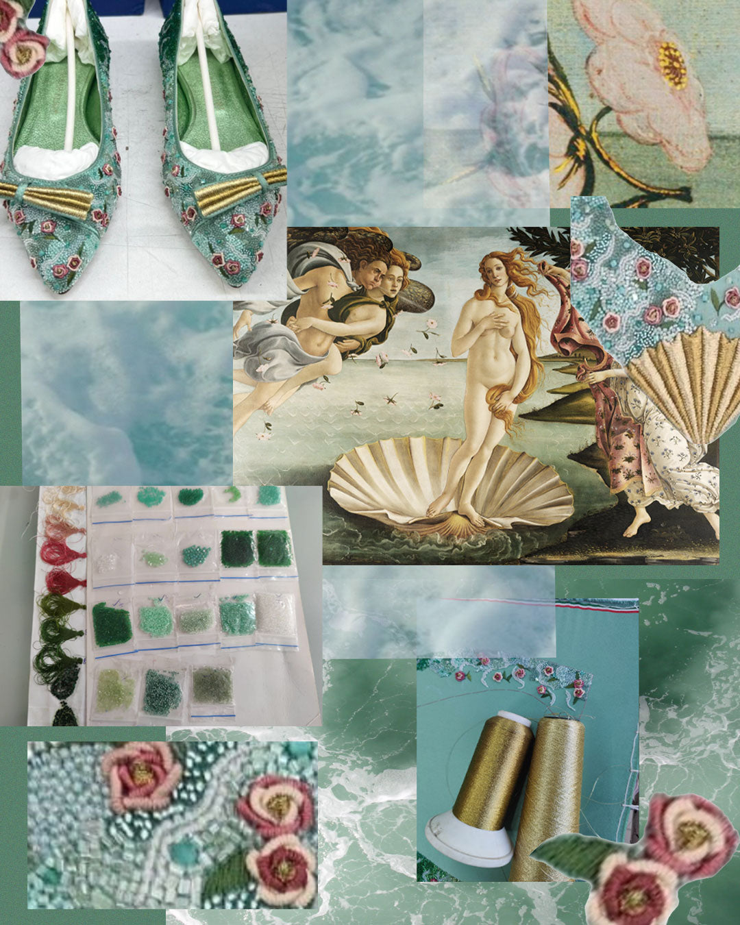 The degradé water effect is brought to life through 16 shades of green silk and two transparent crystal threads, evoking the movement of crashing waves. Delicate rose motifs emerge from five shades of pink and three shades of green silk, finished with bullion stitching for added depth and texture. Finally, two shades of gold metallic yarn form a radiant cap toe, echoing the luminous shell at the heart of the painting.