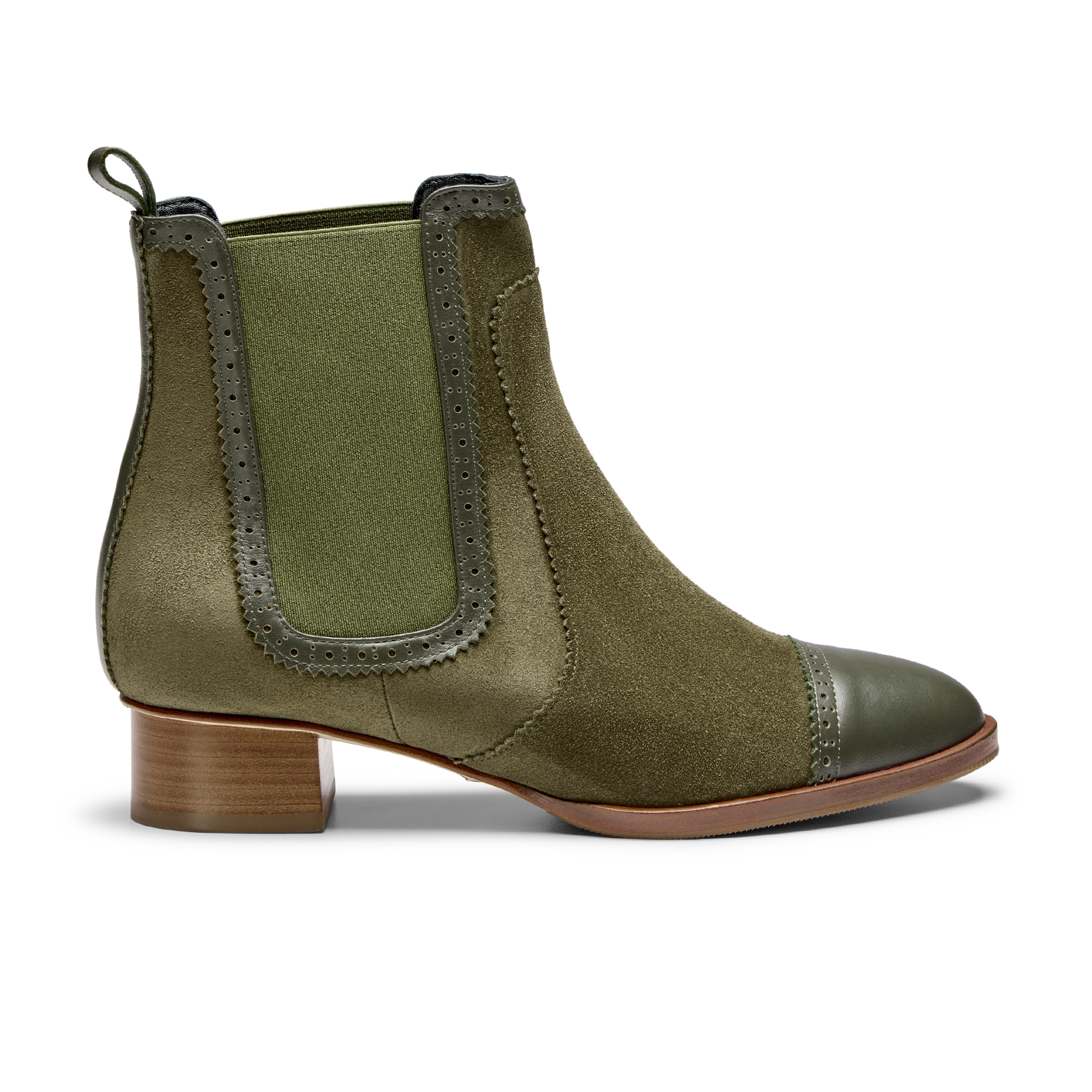 Introducing the Perfect Britta Boot: An essential and comfortable ankle boot for fall, crafted from water-resistant olive crosta suede. Part of the Perfect Collection, this boot merges a timeless silhouette with modern, comfort-driven features. Set on a chic stacked leather heel with an inset block, it provides height without the heaviness of a traditional block heel.