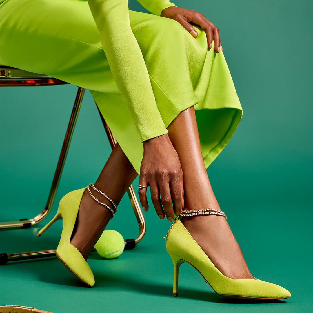 From the stunning collaboration with social impact fine jewelry brand Shiffon: the Perfect Shiffon Pump 85 in optic yellow suede. This party-perfect heel features two interchangeable ankle straps: one an adjustable crystal chain, and one an adjustable buckle strap.