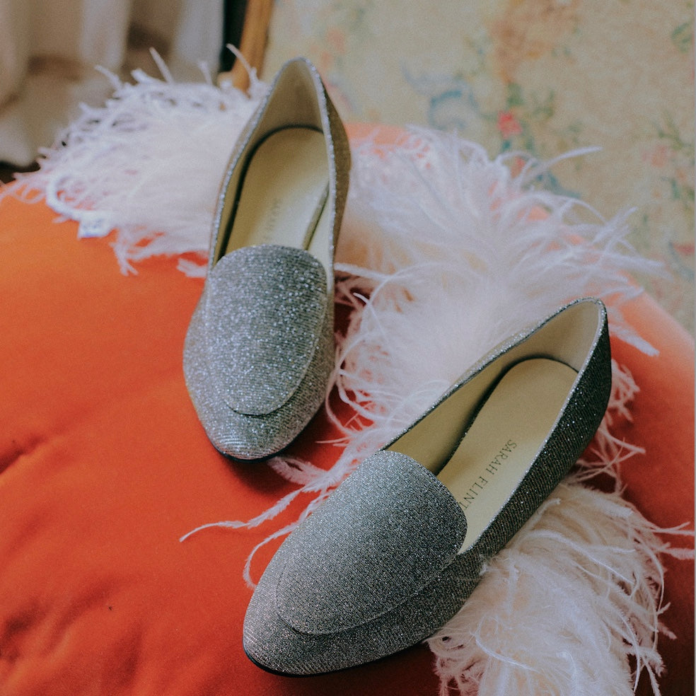 Classic and comfortable in sparkling gunmetal lame, our low-heeled loafer provides the right amount of lift for everyday wear.